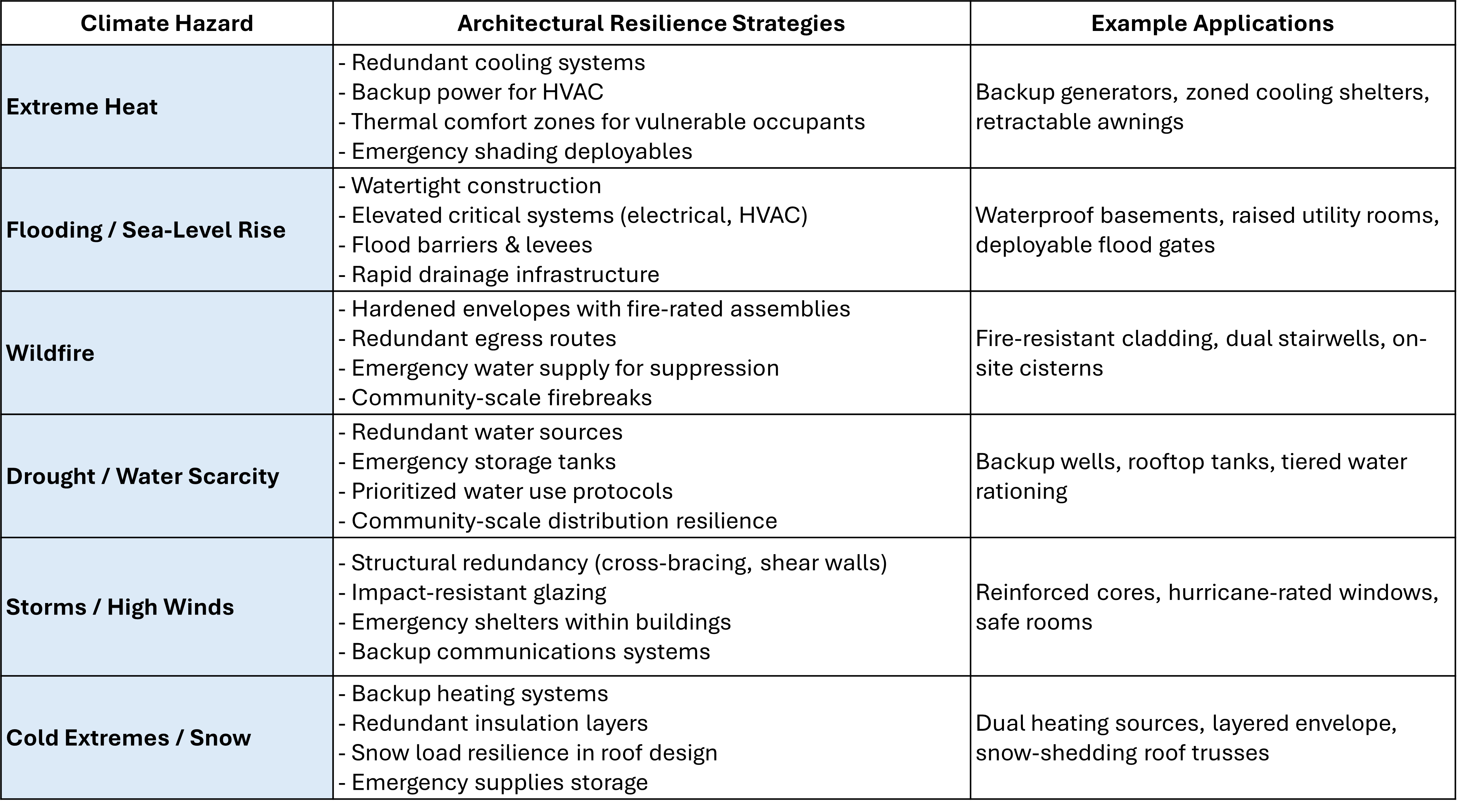 Creating buildings that can absorb shocks and keep functioning during disruptions. It focuses on durability, redundancy, and smart planning so structures stay safe, stable, and usable during events like heat waves, floods, or power outages—and bounce back quickly afterward.